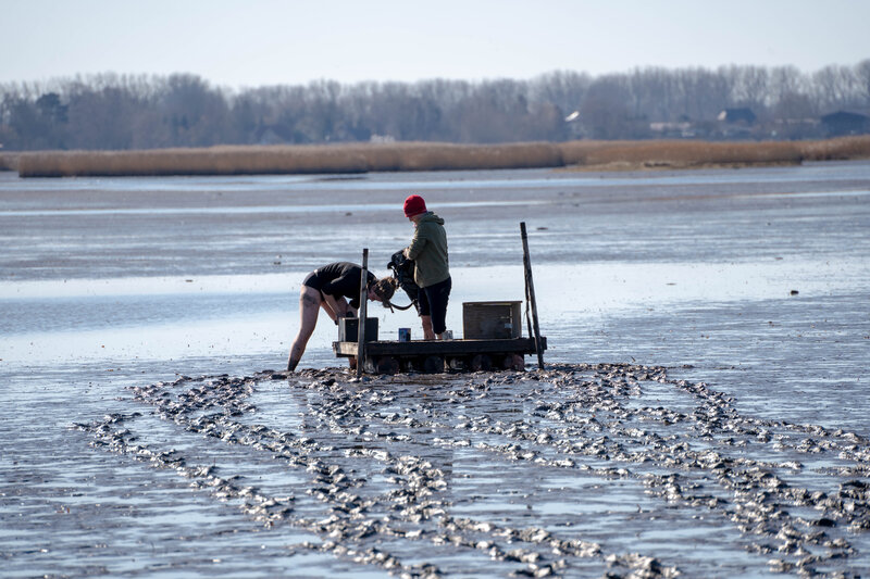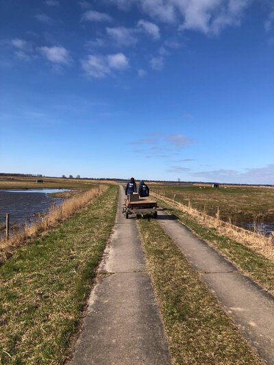 Bei niedrigem Wasserstand war es dann soweit. Wir zogen das Brutfloß auf einem Bootsanhänger bis in die Karrendorfer Wiesen. Auf den letzten 100 Metern war der Boden allerdings zu weich, weshalb wir beschlossen, das Floß zu tragen. Doch auch für uns war der Boden zu weich. Wir blieben mit unseren Gummistiefeln im Schlamm stecken. Da half nur, die Schuhe und Socken auszuziehen, die Hosenbeine hochzukrempeln und es barfuß zu versuchen. Wir versanken noch immer bis zu den Knien im Schlamm, aber kämpften uns trotzdem durch und konnten das Floß schließlich an der richtigen Stelle abladen. Dort wurden die letzten Montagearbeiten durchgeführt und tadaaa – es war geschafft!