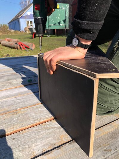 Bevor das Floß dieses Jahr ins Wasser gelassen werden konnte, mussten einige Reparaturen durchgeführt werden. Verrostete Schrauben wurden ausgetauscht und die Auftriebskörper mit alten Fahrradschläuchen am Floß fixiert. Außerdem zimmerten wir zwei kleine Häuschen, die den Möwen(nestern) Schutz vor Witterung und Prädatoren bieten sollen.