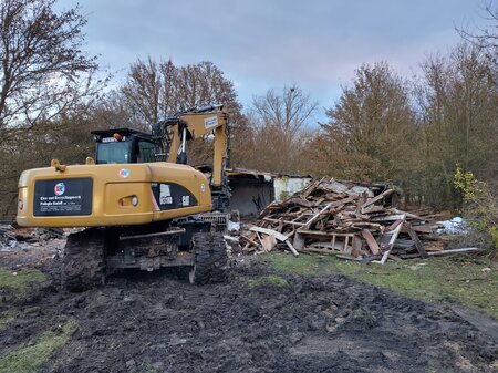 Ende November wurde es ruhiger beim Kranichzug, dafür umso lauter auf der Insel. Im Auftrag des STALU begann ein Recyclingunternehmen mit dem Rückbau eines alten Gebäudes. Zwei Wochen lang waren täglich Bagger und LKWs im Einsatz.