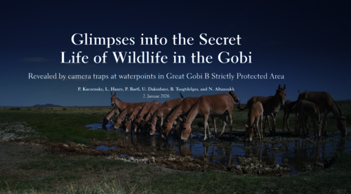 Using camera traps installed at water points in the strictly protected Great Gobi B Strictly Protected Area, the movements and encounters of a wide range of wildlife were documented — from Khulan and Przewalski’s horses to wolves, snow leopards and birds.