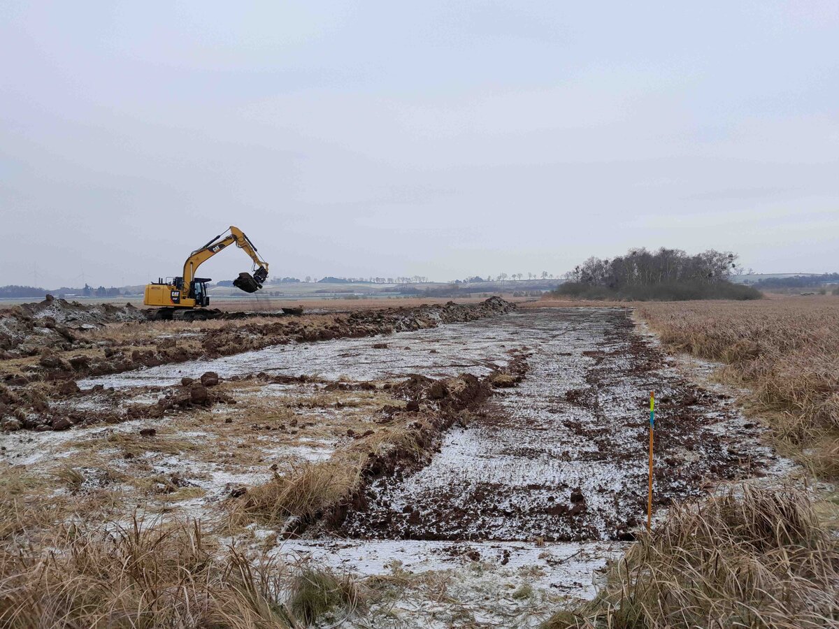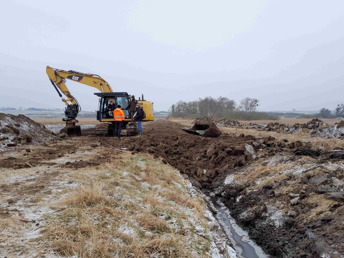 Zunächst erschwerte tiefer Bodenfrost den Abtrag des Oberbodens. In den folgenden Wochen sorgte dann aufgeweichter Boden über einem verbliebenen Eishorizont für zusätzliche Herausforderungen. Dennoch konnten wichtige Arbeitsschritte umgesetzt werden: Die ausgebauten Staue wurden gesammelt und für den Abtransport vorbereitet, Grabenprofile gereinigt und ein Großteil der Entwässerungsgräben bereits verfüllt. Insgesamt 13 der 14 Gräben innerhalb der Projektfläche sind inzwischen bearbeitet.