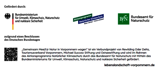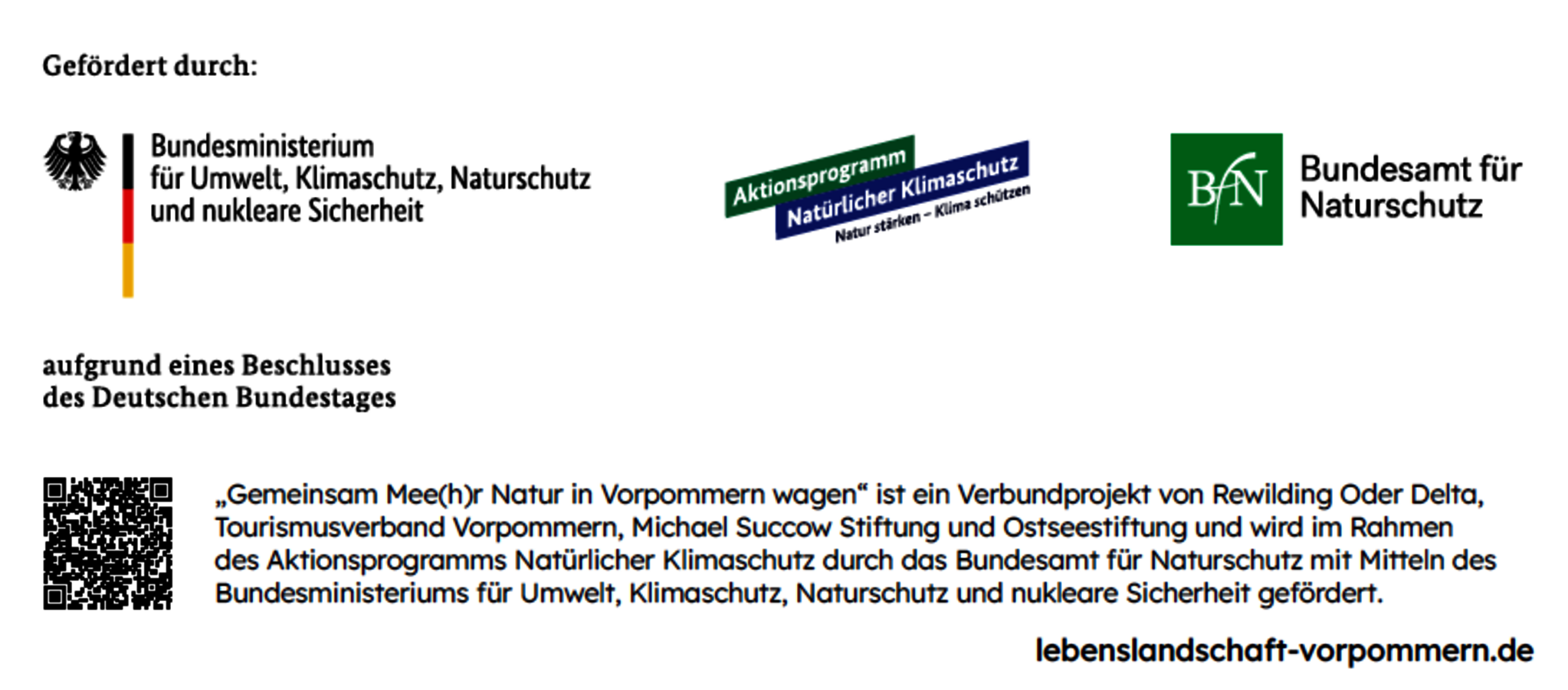 Das Projekt wird im Rahmen des Verbundprojekts „Gemeinsam Mee(h)r Natur in Vorpommern wagen“ umgesetzt und durch das Aktionsprogramm Natürlicher Klimaschutz des Bundesamts für Naturschutz mit Mitteln des Bundesministeriums für Umwelt, Klimaschutz, Naturschutz und nukleare Sicherheit gefördert.
