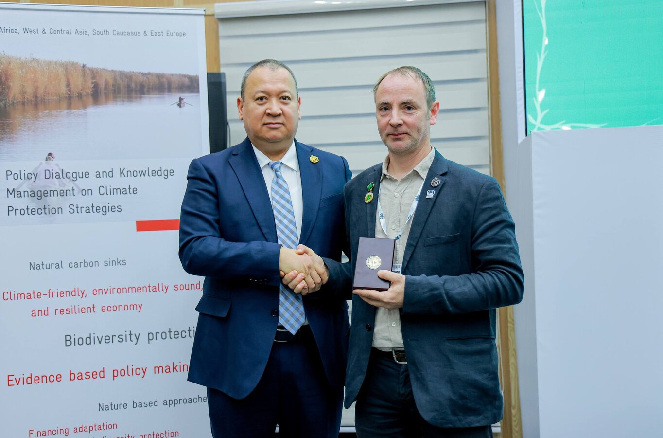 In seiner Laudatio hob Jusipbek Kazbekov, stellvertretender Vorsitzender des Nationalen Komitees für Ökologie und Klimawandel Usbekistans, die wichtigsten Verdienste von Jens Wunderlich für den Naturschutz in der Region im Rahmen der 15-jährigen Projektarbeit der Succow Stiftung hervor.
