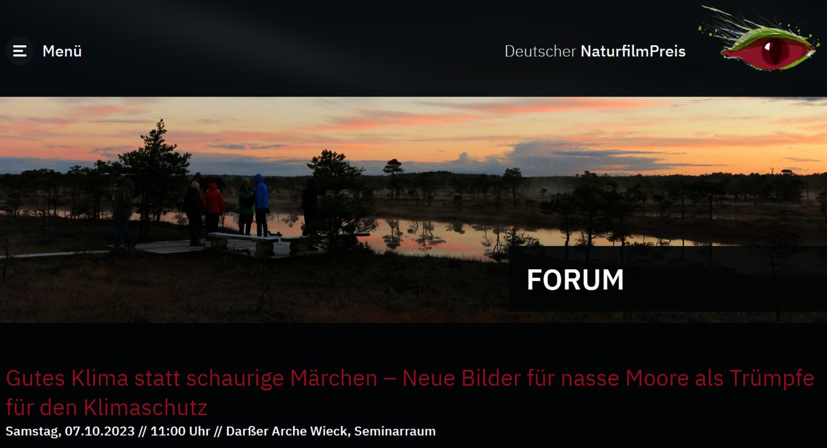 "Gutes Klima statt schaurige Märchen – Neue Bilder für nasse Moore als Trümpfe für den Klimaschutz" - auf dieser Veranstaltung des diesjährigen Deutscher Naturfilmfestival geht es um das einschlägige Image von Mooren. Es ist weitgehend schlecht, aber das ziemlich ungerechtfertigt und muss sich ändern. Besonders die Klimaleistung nasser Moore ist eigentlich eine wunderbare Geschichte, wie Swantje Furtak, freie Moorjournalistin, und Prof. Dr. Hans Joosten, Moorwissenschaftler im Greifswald Moor Centrum, in einer Podiumsdiskussion am Samstag, 07.10.2023 um 11:00 Uhr im Seminarraum der Darßer Arche berichten. Moderiert von Jan Peters, dem Geschäftsführer der Succow Stiftung wird die Veranstaltung auch online übertragen.