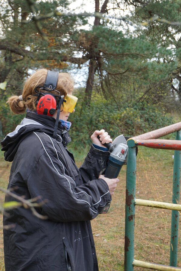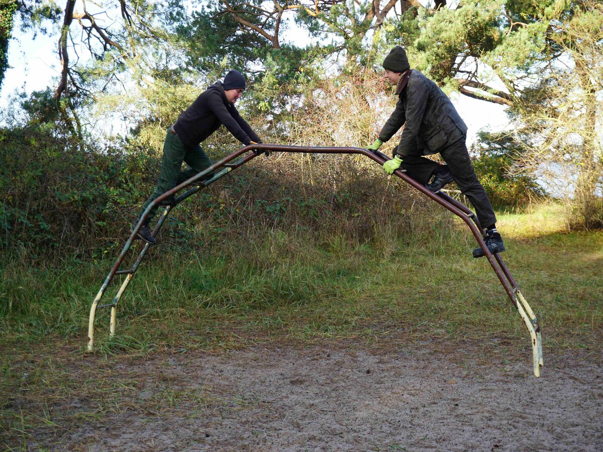 Der alte Spielplatz am Strandbad Ludwigsburg / Lanken im Naturschutzgebiet Lanken war nicht mehr sicher: Teile des Stahlgerüsts waren durchgerostet oder fehlten bereits. Gemeinsam mit freiwilligen Helfer*innen hat das Team der Michael Succow Stiftung den Platz binnen kurzer Zeit abgebaut.