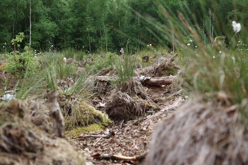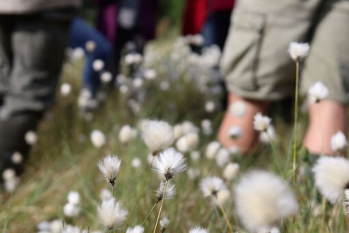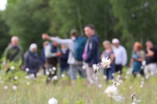 Für gut 20 Personen ging es durchs frühsommerliche Mannhagener Moor. Wollgras und Sumpfporst leuchtete schon von Weitem weiß. Im Kleinen konnte die Exkursion die zartrosafarbenen Blüten der Gemeinen Moosbeere und der Rosmarinheide entdecken.