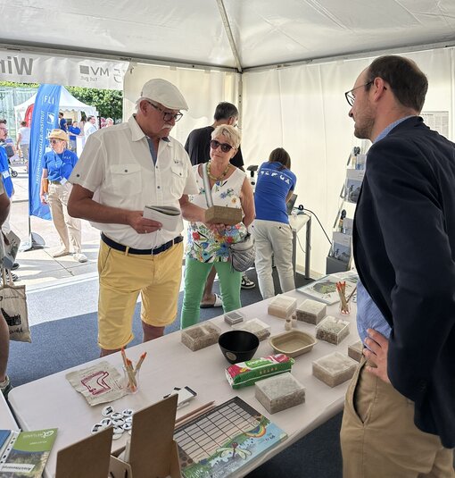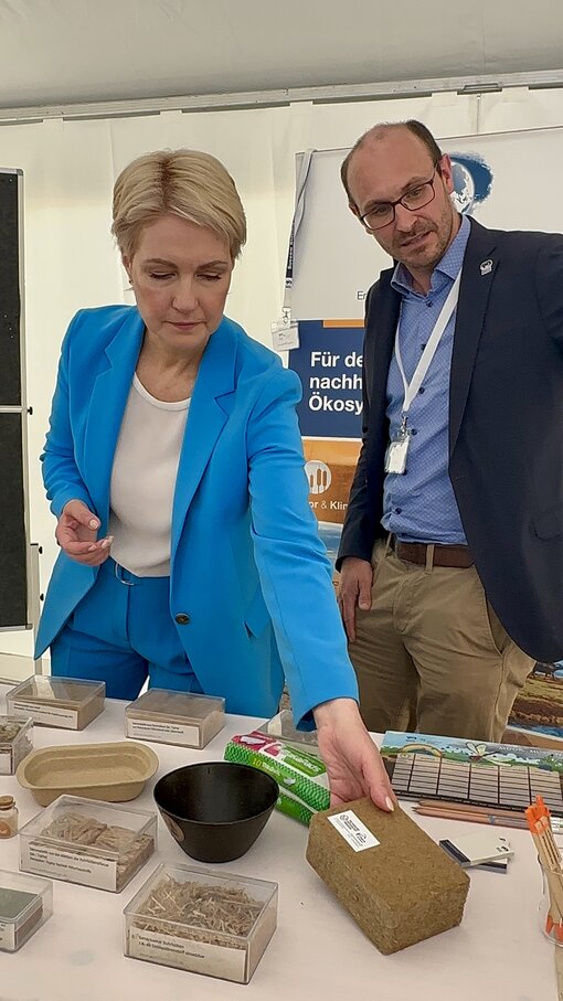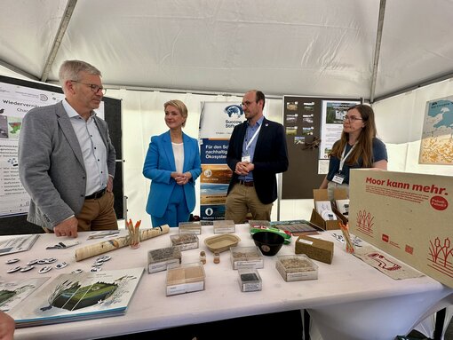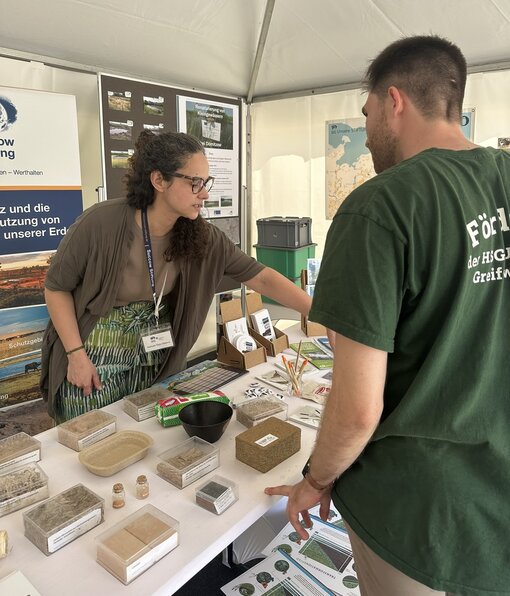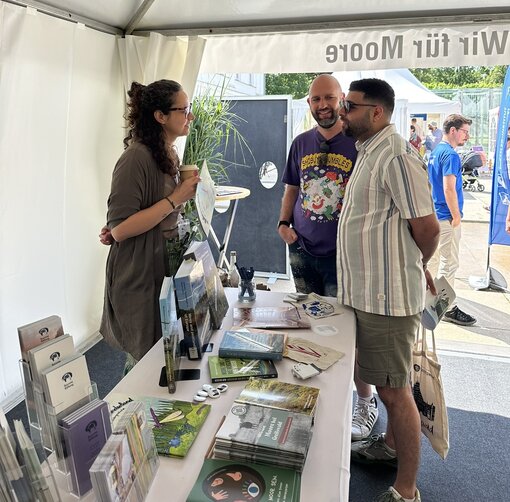 Mitten im Geschehen: unsere Moorpagode „Wir für Moore“ auf dem Vorplatz des Pommerschen Landesmuseums. Gemeinsam mit dem Greifswald Moor Centrum, dem Moormanagement der Universitäts- und Hansestadt Greifswald und dem Friedrich-Loeffler-Institut zeigten wir, wie vielfältig, praxisnah und innovativ moderner Moorschutz ist.
